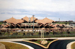 宮古空港は那覇から飛行機で約45分の位置にあり、東京や大阪からの直行便や、多良間島への便も運行しています。空港ターミナルのデザインは、サシバ(毎年秋になると宮古島や伊良部島などに飛来してくる渡り鳥)をイメージしており、赤瓦が印象的な南国情緒溢れる建物。また、ハートビル法に基づく認定建築物で、車イス使用者のための公衆トイレや公衆電話、エレベーターなども設置されています。宮古島市平良の市街地へは車で約15分で移動できます。