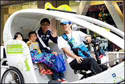 沖縄県が1990年以降2000年までに排出した二酸化炭素は、12,143千t-CO2で、33%も増加しています。運輸部門の増加率は42.4%増(沖縄県報告)。地球温暖化に歯止めが利かず、沖縄だけでなく、地球全体の自然が破壊されています。地球温暖化を防止するために、子ども達の未来のために、私達に出来ることはなんでしょうか。「VELOTAXI」は 人力により静かに走行する、CO2を削減するための有効な移動手段です。ゆっくりと風を感じながら移動する「VELOTAXI」は、那覇の街の新しい魅力を発見するとともに、スローライフを体感いただける古くて新しい乗り物です。