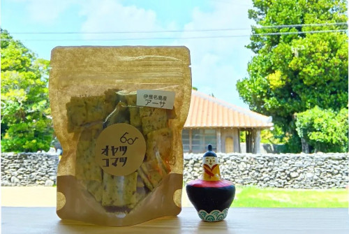 途中、伊是名島産のアーサやもずくなどを練り込んだクラッカーで腹ごしらえ。お土産にも喜ばれますよ。