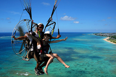 中城湾上空でモーターパラグライダーによるタンデムフライトが体験できます。