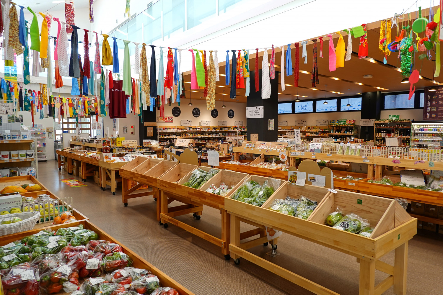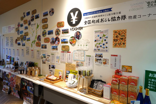 壁面には、それぞれの地域の特産物を集めた「全国地域おこし協力隊物産コーナー」があります。