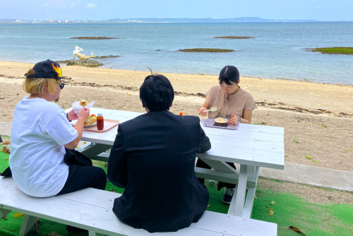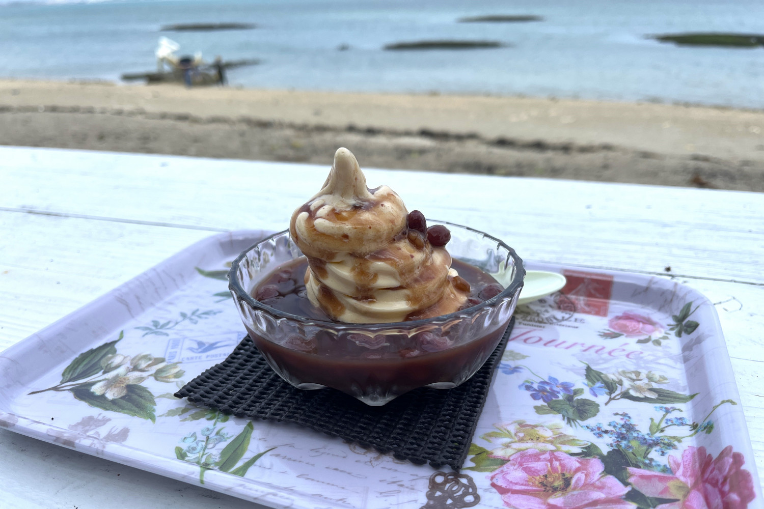 おすすめの「まぎータコス」「アルゼンチンチキン」「ぜんざいサンデー」をいただきます。まぎーとは沖縄の方言で大きいを意味します。あまりの大きさに1個でおなか一杯になりお土産として持ち帰りました。アルゼンチンチキンは、アルゼンチン在住経験のあるかたが味付けた本場の味です。そしてデザートは、ここでしか食べられないという噂のぜんざいとサンデーのコラボレーションです。静かな波音をききながら、まったりと過ごすことができました。