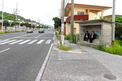 こちら伊集のバス停です。ブロックを積み上げて作られたバス停には、1967年1月15日と刻印があります。まだ復帰前で、車は右側通行だった時代、右側車線を那覇から来たらよく見える場所にバス停が建っています。その当時の空気が感じられる場所です。