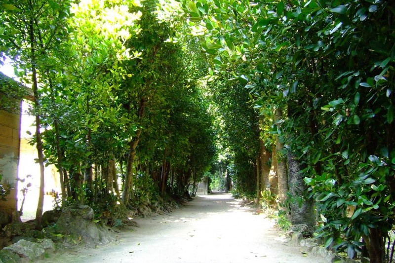 まるでフクギのトンネルのような神秘的な空間がひろがっているこちらのスポット。海洋博公園近くの備瀬地区、碁盤の目のように区画した村落で、約250戸ある住宅のほとんどは繁茂したフクギの屋敷林に囲まれています。数千本に及ぶとみられる備瀬のフクギのなかで、もっとも古いものは推定樹齢300年といわれており、濃い緑の葉の間から差し込む柔らかな陽光が、訪れる人々の心を穏やかに癒してくれます。