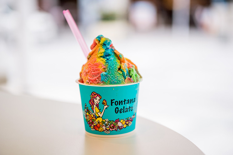 国際通りの交差点でひときわ目を引くアクアマリンの外装が目印で、カラフルなジェラートに通行人が足を止める人気店。こちらのお店のフレッシュなジェラートは、契約農家から仕入れたグァバやマンゴー、紅芋などの県産素材を使って作られており、人気のレインボーミルクやグァバなどの定番の味わいや旬素材を使った期間限定メニューが楽しめます。