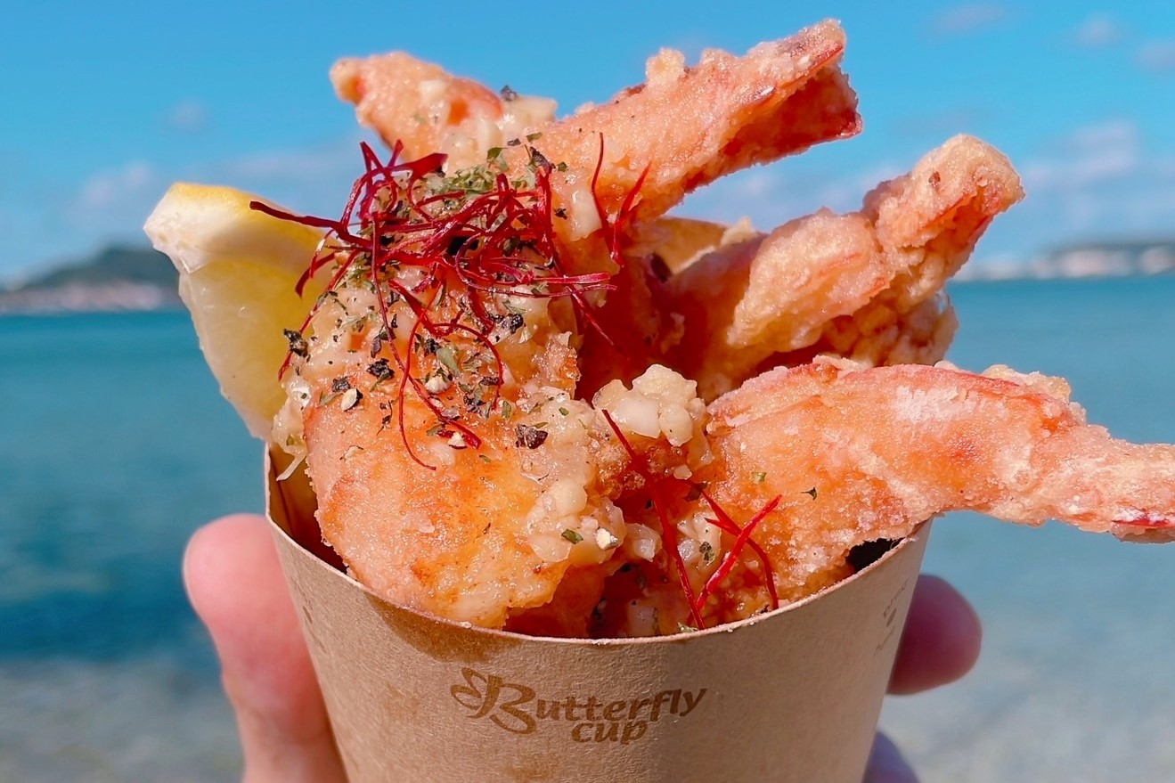 2022年10月浜比嘉島にオープンしたガーリックシュリン プ専門店、ココシュリンプが3月1日(水)リニューアルオープンしました!今回はもっと多くの人にココシュリンプを楽しんでほしいと、「食べ歩き用のココシュリンプ」が新メニューとしてリリースされました!また、お店のレイアウトも大きく変更し、新しく屋根をつけて、涼める場所を作り、多くの人の憩いの場になるようになりました!浜比嘉島の絶景と、絶品ガーリックシュリンプをぜひ一緒に楽しみませんか?