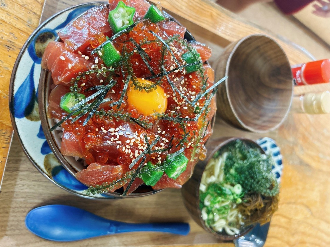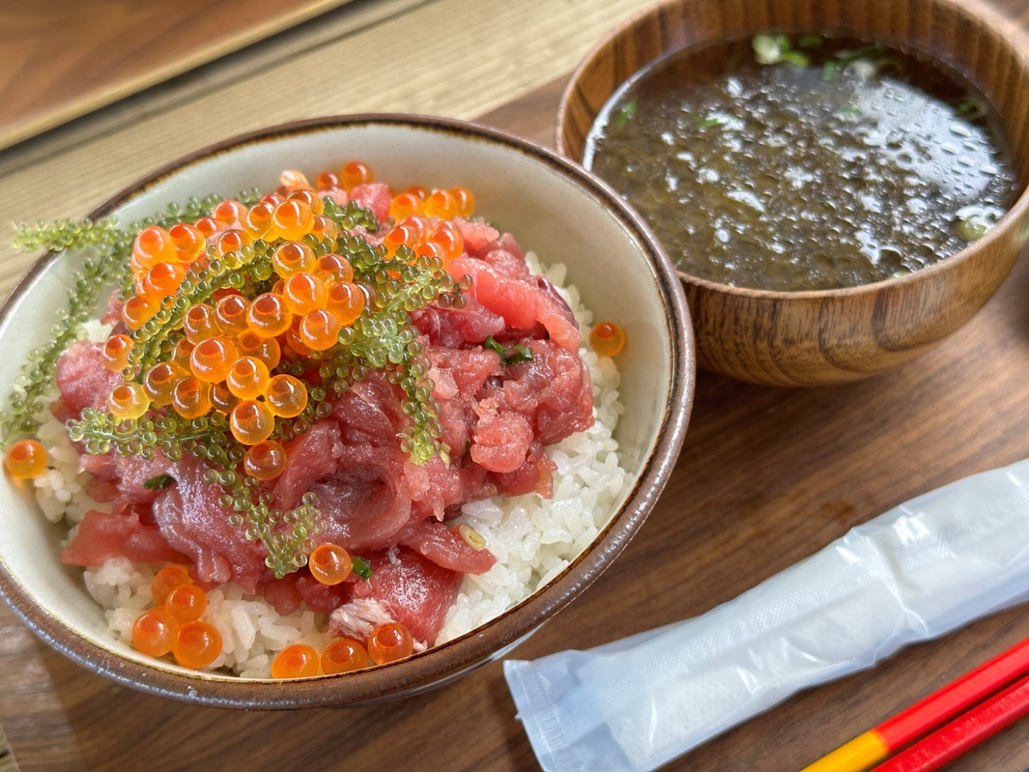 丼に乗っているまぐろは、口に入れるとほんのり甘く濃厚な旨味が口いっぱいに広がります。また、まぐろの上に載っている”海ぶどう”やスープの中に入っている”もずく”も地域で獲れたものを使用しています。