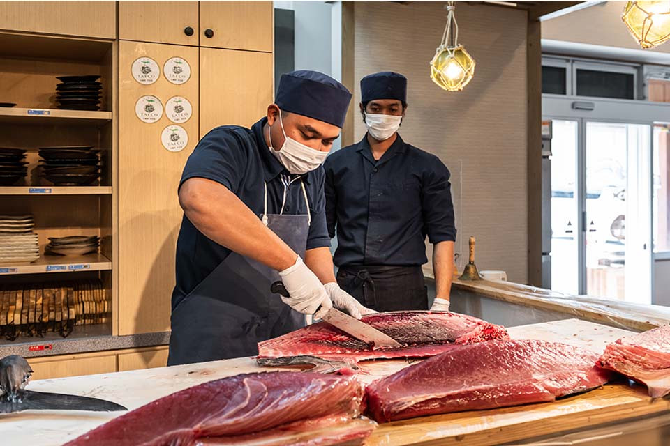 毎日2回、市場直送の「まぐろの解体ショー」が行われており、部位の説明も行うので大人も子供も楽しく美味しく学べます。こちらのイベントは毎日300〜400本のまぐろを買い付けているからこそ実施できる人気のイベント。目の前でまぐろが手際良く捌かれる様子は圧巻です。