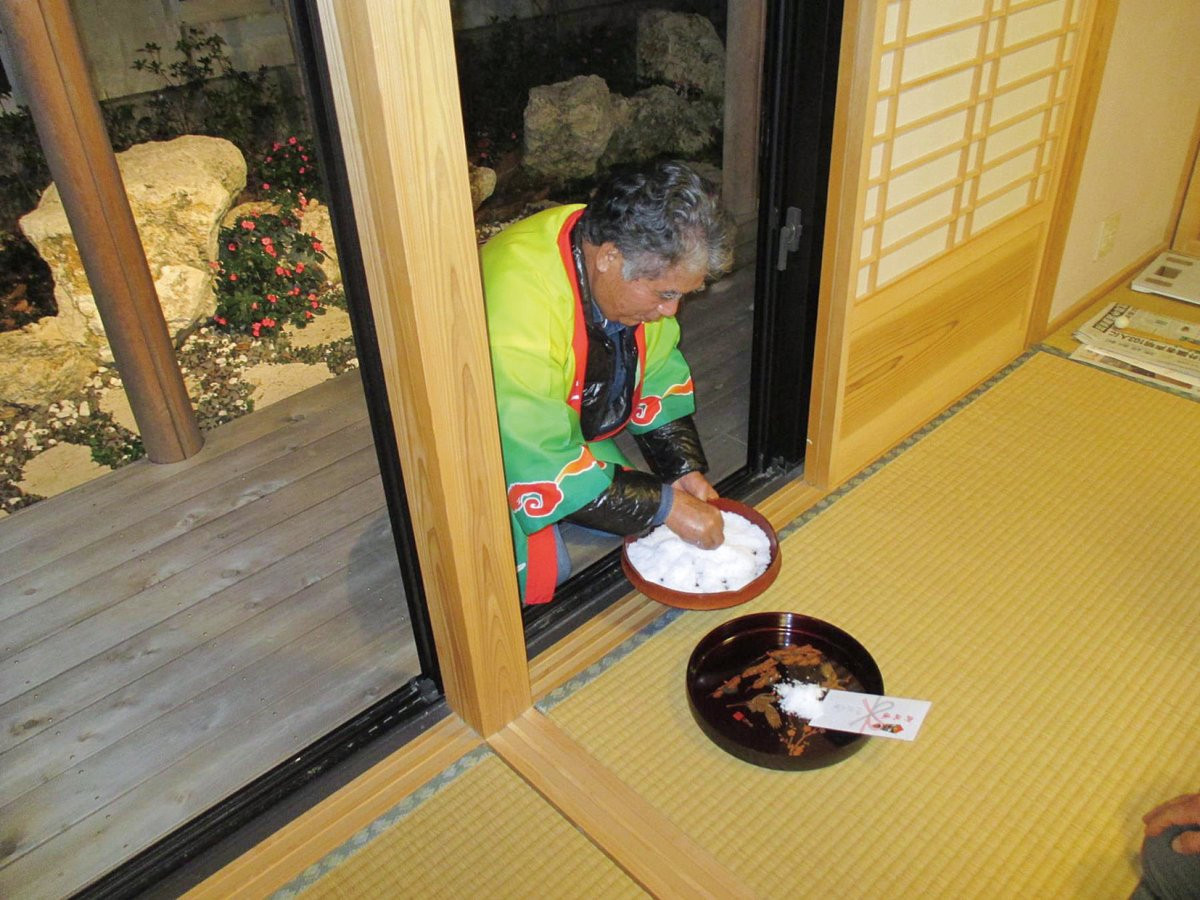 粟国島には、旧暦の大晦日の夕方から元旦にかけて行われる「マースヤー(塩売り)」と呼ばれる伝統行事があります。当日は地元の人々が各家庭に塩を配りながら練り歩き、地域ごとに継承された様々な型の踊りや歌を披露して、無病息災と豊穣を祈ります。