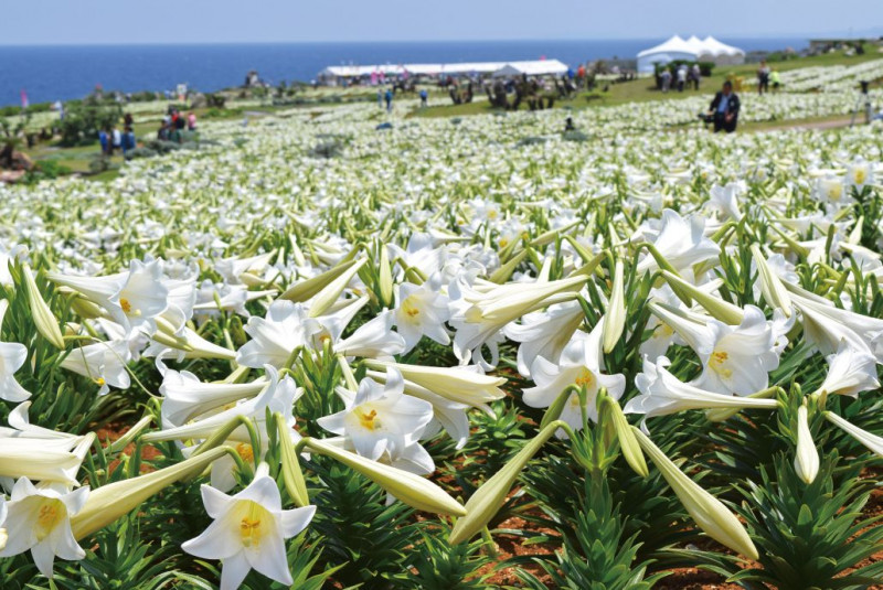伊江島のリリーフィールド公園では、毎年4月下旬から5月半ば頃にかけて、日本一早い「ゆり祭り」が行われます。100万輪の百合が一斉に咲き誇る姿は、濃紺の美しい海に真っ白な花の絨毯が敷かれたような圧巻の光景。世界中約90種類ものユリがいちどきに鑑賞できる、伊江島を代表する花の祭典です。