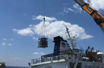 同じように、人の乗船・下船もクレーン経由。定員12名の小さなゴンドラが、海面から十数mの高さまで釣り上げられ、人を乗せて移動します。風に煽られて揺れるクレーンでの空中散歩はスリル満点です。