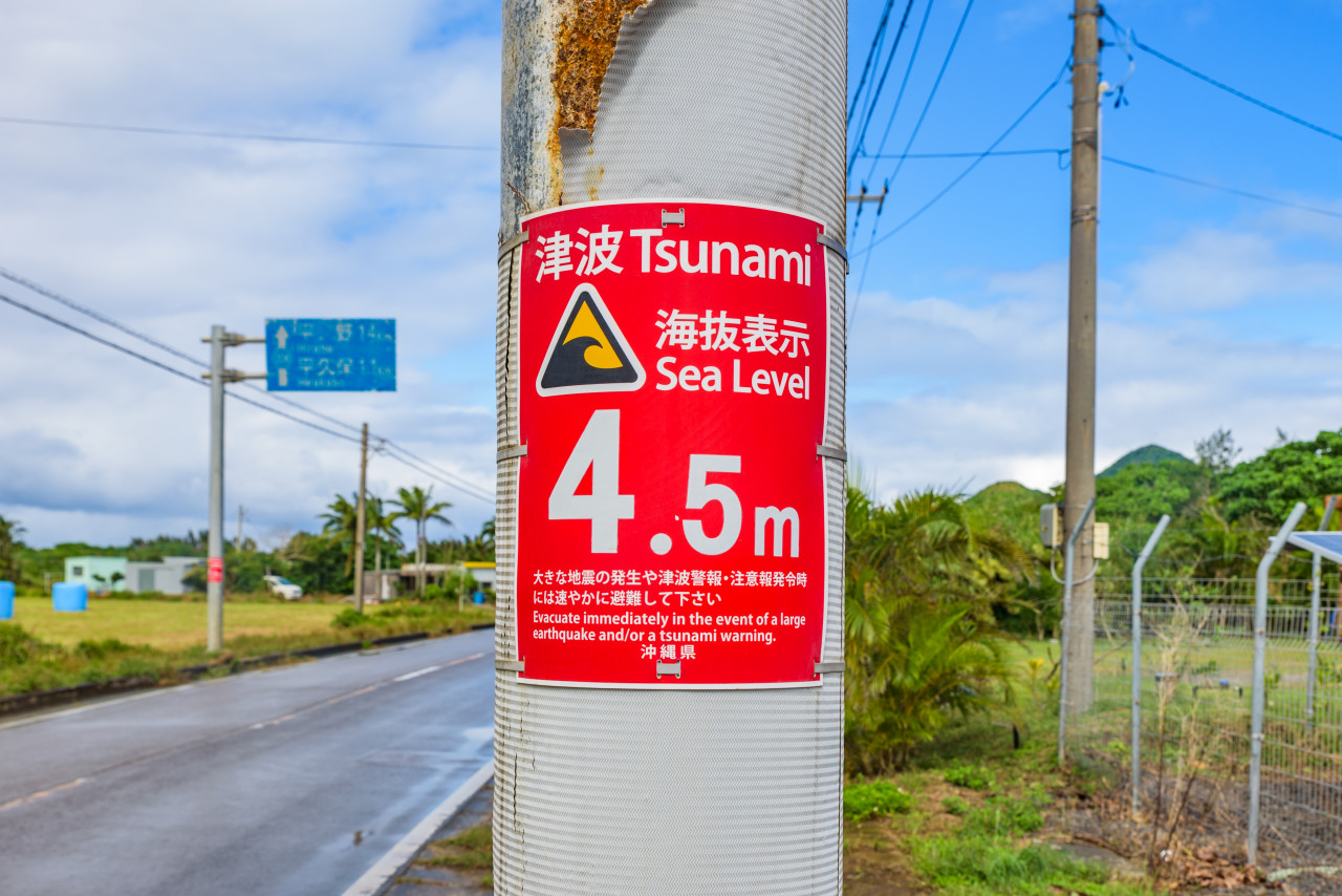 旅行中に大きな地震が起きた際、宿泊施設や観光施設にいる場合はあわてて外へ飛び出さず、揺れが収まってから従業員の指示に従って避難しましょう。地震後は津波が起きる可能性もあるので、ビーチや海岸の近くにいる場合はすぐに海から離れ、高台や高層の建物などに避難します。県内の主要な観光地には、その場所の海抜を示す看板が設置してあるので、到着時にあらかじめ確認しておくと安心です。