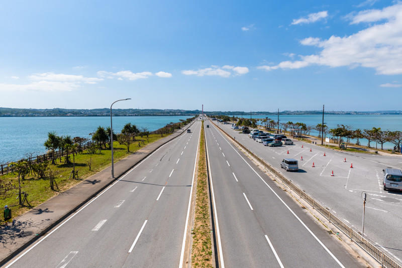 沖縄本島の与勝半島と平安座島を結び、浜比嘉島、宮城島、伊計島へのアクセスにも便利な海中道路。車だけで4つの島々を巡るという、貴重な体験ができます。道路の両側にはまばゆい絶景が続き、まるで海の上を走っているような感覚で、爽快なドライブが楽しめます。途中には飲食店や土産品店などが入った「海の駅あやはし館」があり、休憩がてら美しい景色を眺めるひとときも過ごせます。