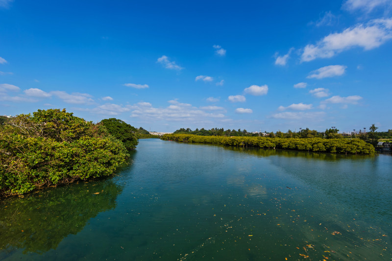 億首川は、沖縄本島でもっとも種類が多いマングローブ林が河口部に生い茂る川。貴重な自然環境があることから、2011年に「日本の重要湿地100」に選定されています。生息する野鳥の種類も多く、バードウォッチングの名所としても知られています。川沿いのマングローブ林内に整備された全長280mの遊歩道では、野鳥やカニなどを間近に観察でき、展望台からは濃緑で覆われたマングローブ林を一望できます。