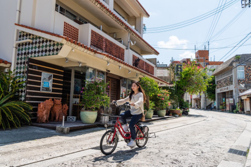 「ちゅらチャリ」で約5分。牧志郵便局前でレンタサイクルを返車し、徒歩で約5分
