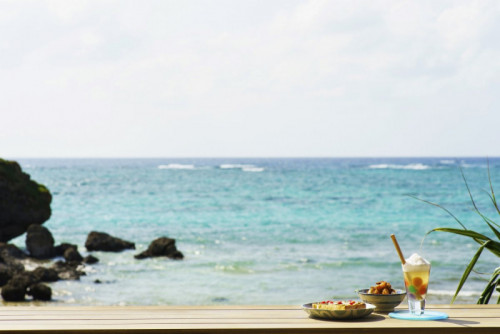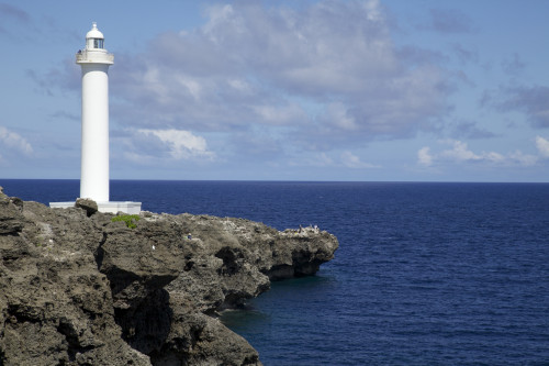 隆起サンゴ礁の断崖に打ちよせる荒波と、エメラルドの海に開かれた眺望