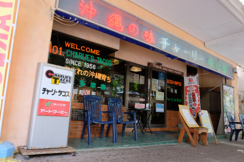 おなかが空いたら、中央パークアベニュー方面へ。コザ名物の「チャーリー多幸寿(タコス)」は、沖縄が米軍の統治下にあった1956年に米軍公認の「Aサインレストラン」として生まれた老舗のレストラン。タコスは日本人の好みに合わせたソフトで香ばしい皮が特徴で、味はビーフ・チキン・ツナの3種類。ライスの上に特製のスパイシーなタコミートと2種類のチーズが乗ったチャーリーライスもおすすめ。レトロな雰囲気を残す店内には、有名、無名や国籍を問わず、これまでに訪れた人たちのメッセージが書かれた紙ナプキンが貼られていて、コザらしい雰囲気を感じることができます。