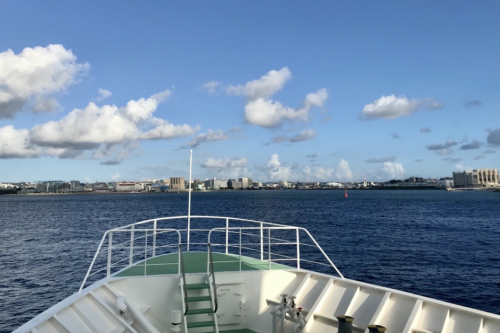 天気が良ければデッキに出てみましょう。途中の離島の数々だけでなく、行きに乗った高速船マリンライナーとかしきとすれ違ったり、上空を飛ぶ飛行機を見ているうちに、那覇の街が大きく見えてきます。