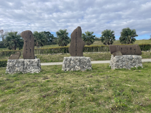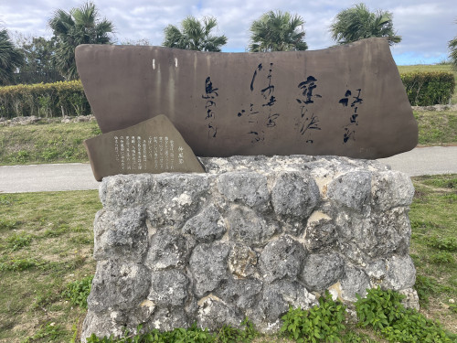 和文学者であり組踊演目「手水の縁」の作者として名高い、平敷屋朝敏(へしきやちょうびん)の誕生300年を記念して「手水の縁」にゆかりのある瀬長島に建てられたこちらの顕彰碑。この石碑には彼がこの瀬長島を理想郷として見立てて歌ったと琉歌が添えられています。