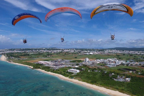 中城湾上空でモーターパラグライダーによるタンデムフライトが体験できます。