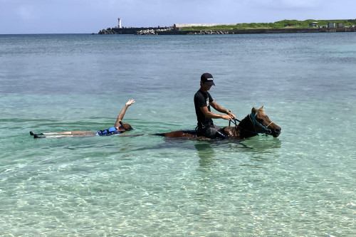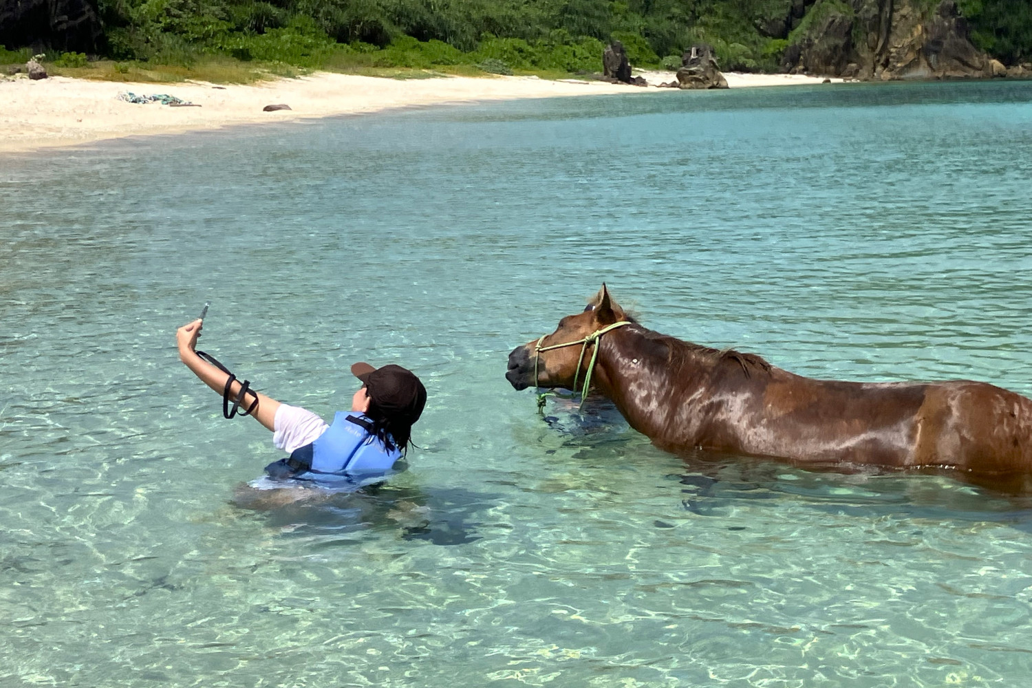 ヨナグニウマに乗って海中をゆったりと歩いたり、尻尾につかまってスイスイ、プカプカと海を漂ったり、与那国ならではの特別なひとときを楽しめます。