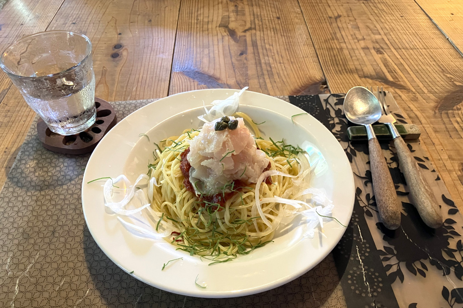 ランチタイムには、島の新鮮な魚を使ったカルパッチョパスタも楽しめます。