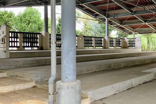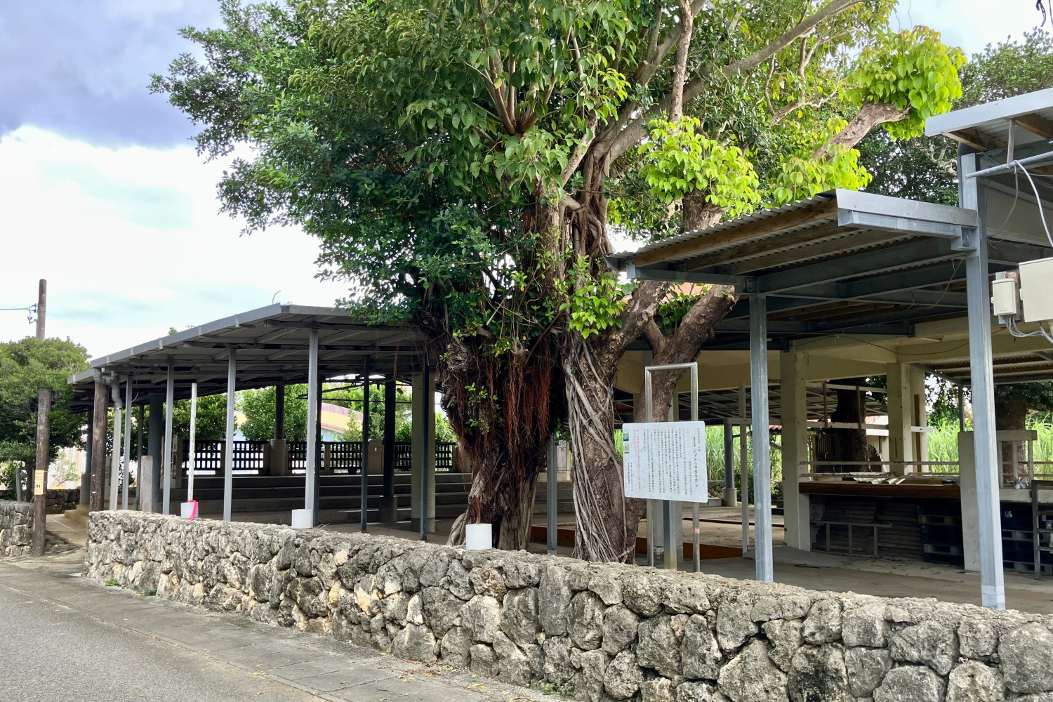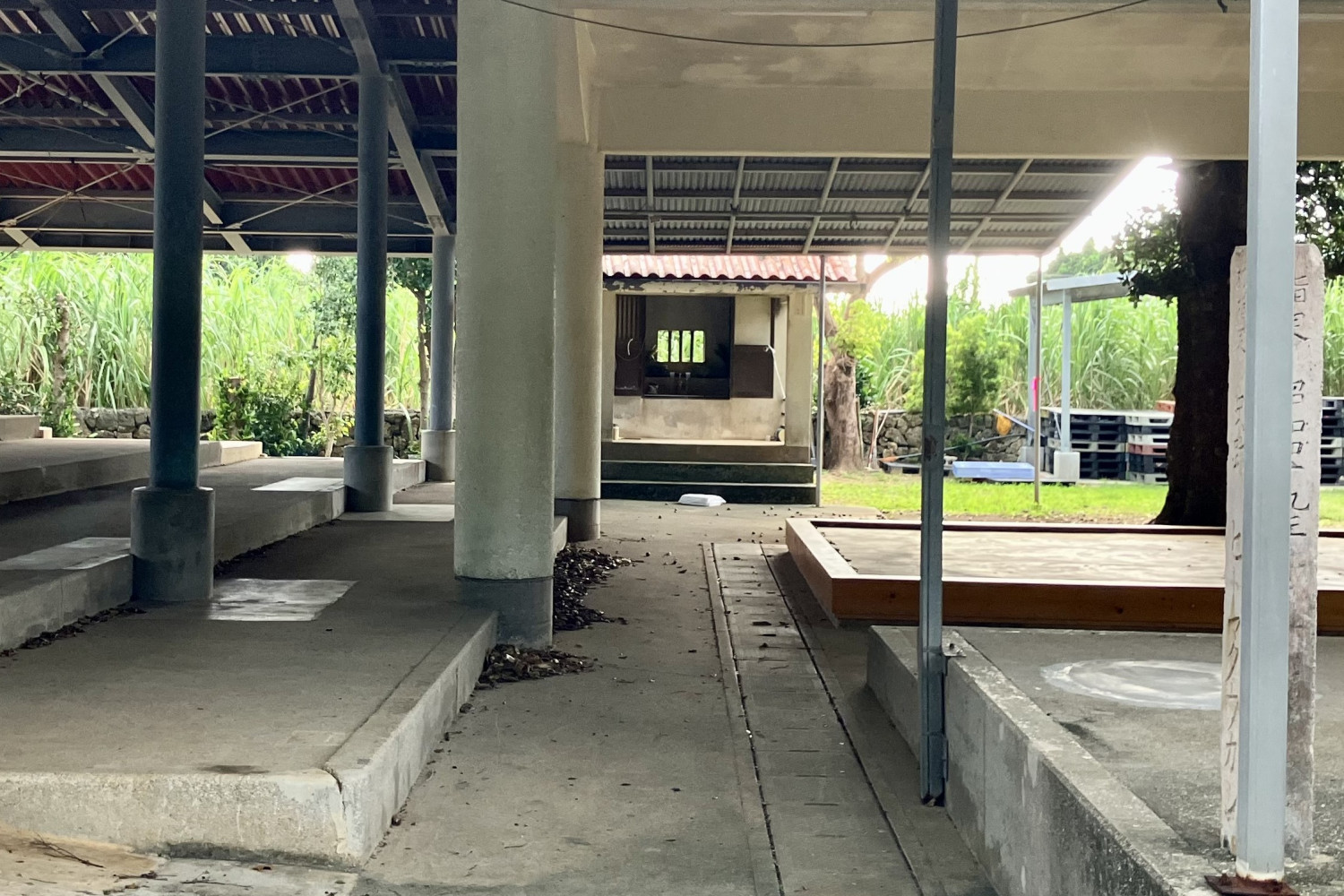 塩川字の八月豊年祭(八月踊り)を公演する場所。守護神の祠が境内の東側に位置し、その西側には舞台が北向きに設けられています。八月御願にはここを出発し、字内各御嶽に参拝し、豊年の感謝と祈願を捧げ、この広場で奉納余興が盛大に演じられます。