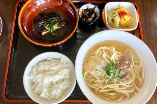 そば定食には、海人(うみんちゅ)でもある店主が、その日に獲った新鮮な島魚を使った一品が付きます。何が出るかはその日のお楽しみ。うつぼの煮つけなど、他では食べられない掘り出し物に出会えるかも!?