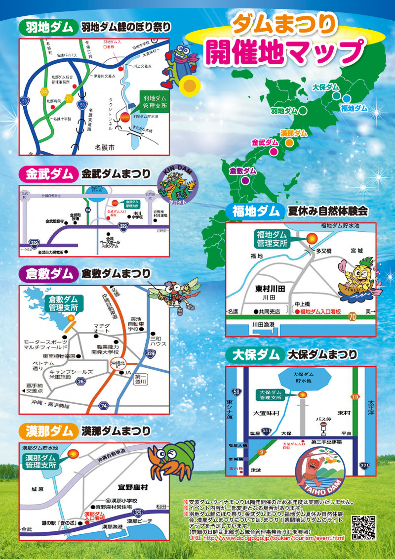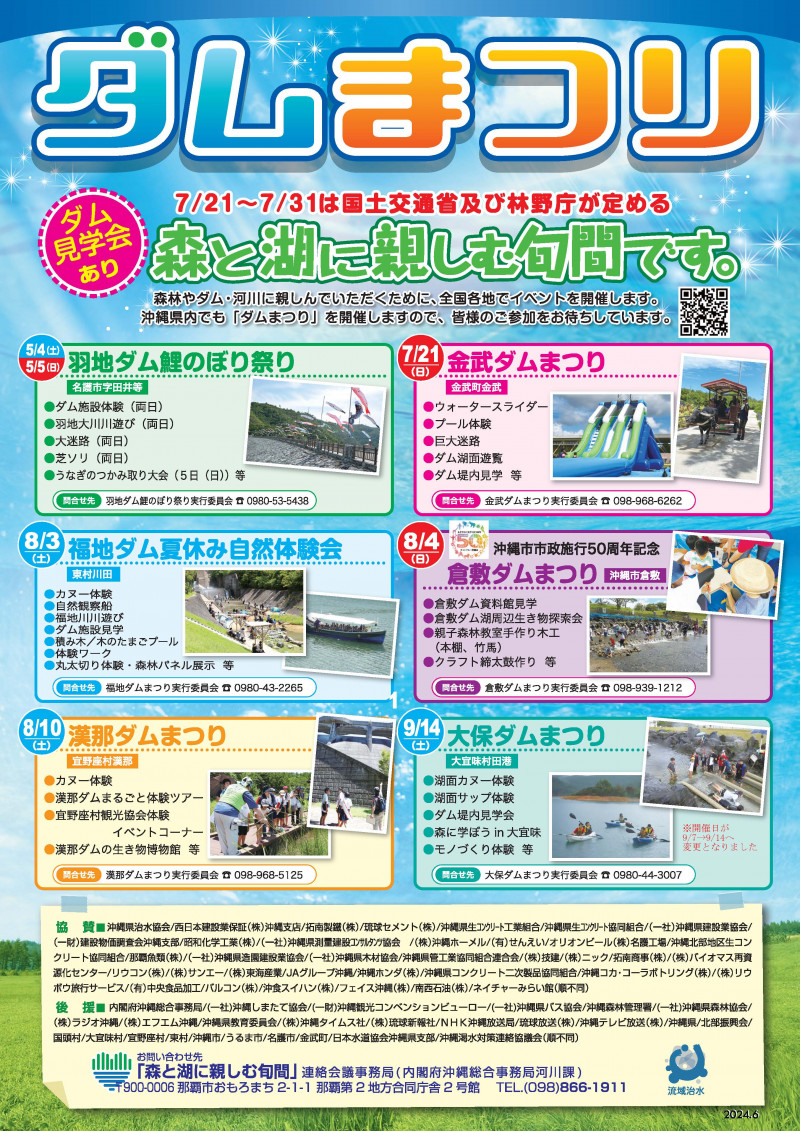 2024年5月4日(土)・5日(日) 羽地ダム鯉のぼり祭り7月21日(日) 金武ダムまつり8月3日(土) 福地ダム夏休み自然体験会8月4日(日) 倉敷ダムまつり (沖縄市市政施行50周年記念)8月10日(土) 漢那ダムまつり9月14日(土) 大保ダムまつり ※台風の影響に伴い開催中止。