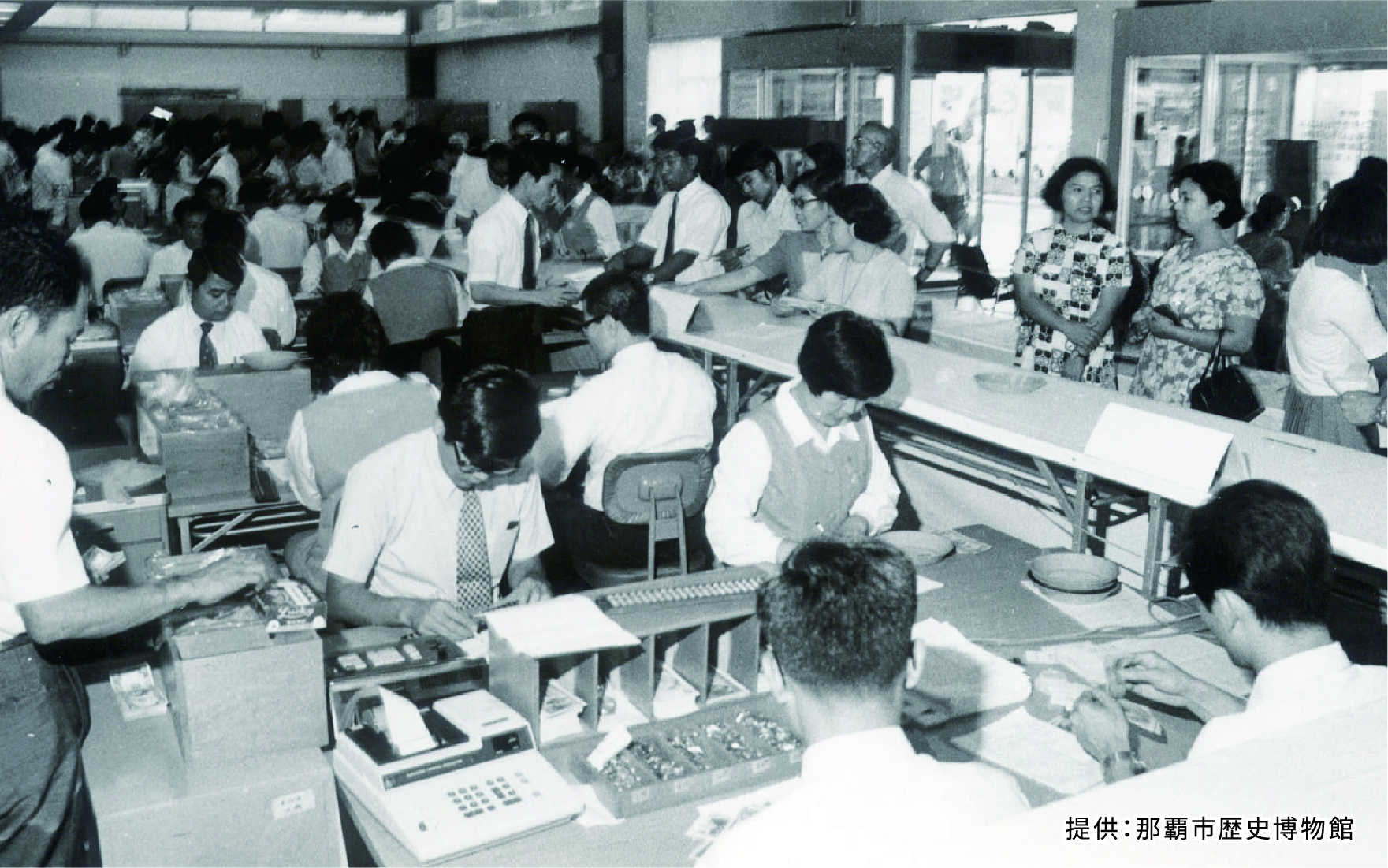 本土復帰に伴い、アメリカドルから日本円への通貨切り替えが行われました。換算レートの問題や便乗値上げなどさまざまな混乱を乗り越えながら、日本円での経済成長を迎えることとなりました。