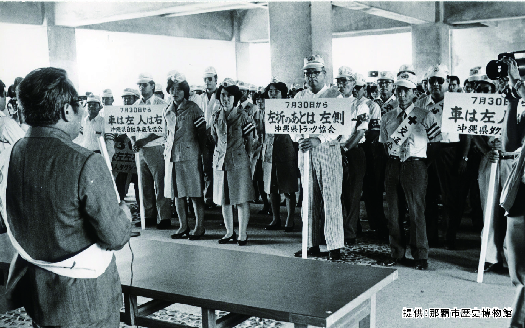 沖縄の本土復帰6年後、1978年7月30日に行われたのが道路交通法の変更、通称ナナサンマルです。自動車の対面交通が右側から左側になり、全国から交通整理警察官も応援にかけつけたと言います。沖縄県庁の敷地内には当時の記憶が刻まれた「730の碑」があります。