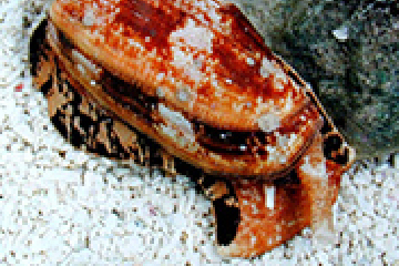 殻の長さが10cmほどになる大きな巻き貝で、赤茶色の網模様が特徴です。神経毒なので刺されても痛みはほとんどないですが、すぐに体がしびれ、溺れる可能性があります。