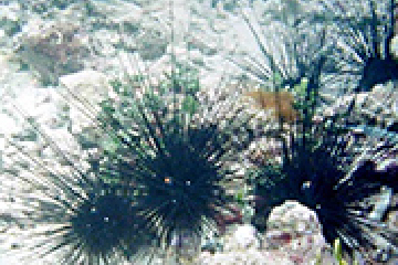 熱帯性のウニで、殻の直径は最大5cm程度ですが、トゲはその3倍ほどの長さがあり先端に毒を持っています。折れた先端部は人間の皮膚の中に残ることが多く、痛みだけでなく患部には大きな腫れが伴います。