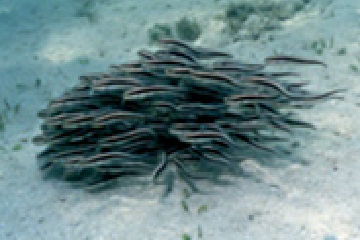 背びれと胸びれに毒トゲを持っています。浅い岩礁や砂地の浅い海に生息し、集団で行動する習性があります。「ゴンズイ球」と呼ばれる集団は、ダンゴ状になって移動します。