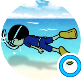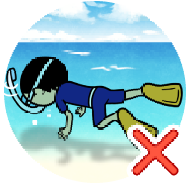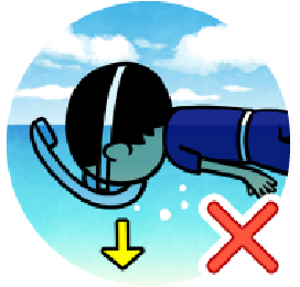シュノーケリングを終えて浜へ戻る際は、腰くらいの深さまで泳いだら、かかとをつけて立つ。そこからは横向きになり浜まで歩きましょう。