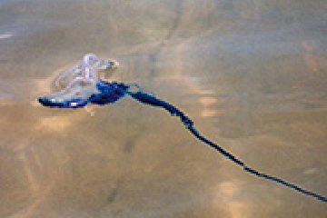 外洋性のクラゲで、青白い浮き袋(気泡体)を持ち、その下面には数本の青く長い触手がたれ下がっています。風の強い日には岸や海水浴場に打ち寄せられることもあります。