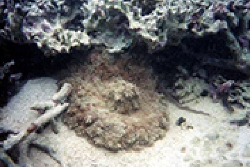 色や形が石や岩に似ており、じっと動かないため知らずに踏みつけて刺されることがあります。背びれにトゲがあり、ゴム底の靴を貫くほど強力です。浅いところにもいるので要注意です。