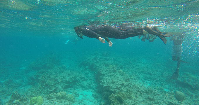 シュノーケリング中は、膝を伸ばしてももの付け根から足全体を大きく上下に動かします。自転車をこぐようなキックはうまく進めないのでNG。