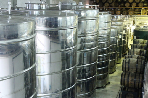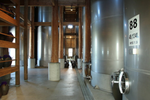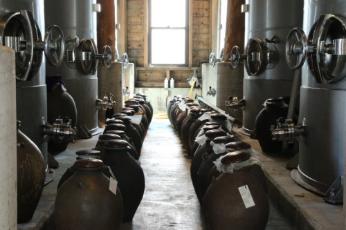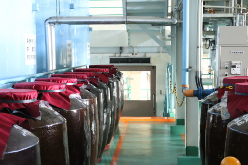 そして最後は「木造古酒蔵」。大きな空の下に堂々とした佇まいを見せている古酒蔵は、木造建築としては首里城に次ぐスケールだそう。一升瓶換算で2万5千本貯蔵のタンクが18本、合計45万本分の古酒と、5升甕、一斗甕が合計約800個が並んでいます。
