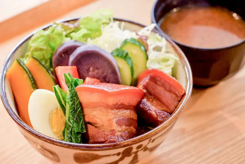 - 北部12市町村と沖縄美ら海水族館などを運営する財団とで構成された「やんばるチームどんどん協議会」との取り組みで、各市町村の特産品を使った丼、「ちむどんどん丼」をお店で提供する企画に参加しています。本部町が提供するのは100年前のレシピを再現した「ラフテー丼」!ラフテーとは皮付きの三枚肉またはヒサガー(皮付きのもも肉)を泡盛や醤油で甘辛く味付けした料理のことで、いわゆる豚の角煮のことを言います。程よい弾力を残しながらも、お箸でスッと切れるほど柔らかく煮込んだラフテーに、やんばるで採れた彩り豊かな野菜を盛り合わせてここでしか味わえない一品に仕上げました。実は僕自身、沖縄が舞台のドラマが新鮮で、テーマになっている「食」の魅力を改めて実感しているところです。沖縄料理は「ぬちぐすい」(沖縄の方言で命の薬)として古くから心と身体に元気を与えてくれるものとされていますので、やんばるの自然に癒された後は、地域で採れた食材を使った沖縄料理を食べて心身ともに元気になって頂けたら嬉しいです。