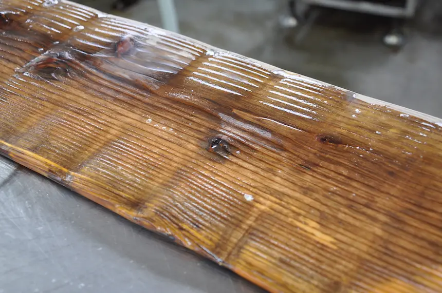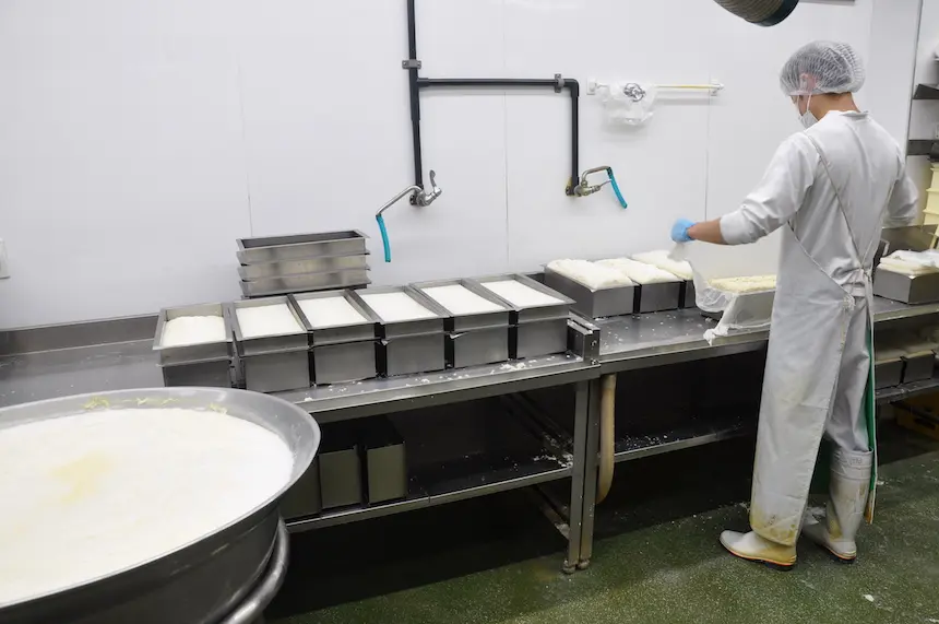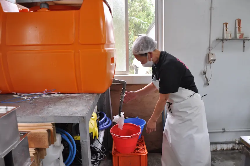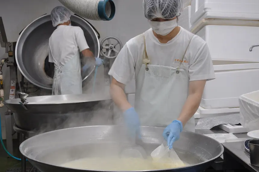 生絞りの豆乳に火入れをした後、にがりを加えて固めるのが島豆腐の作り方ですが、にがりはゆっくり入れるのが一般的。なぜなら豆腐が硬くならないからとされていますが、宇那志豆腐は豪快に高い位置から一気に豆乳の中に注ぎます。「こんな入れ方するところは他ではないようです」と、それがまたおいしさを引き出す秘密だと、社長の次に古株の玉城享さんが教えてくれました。