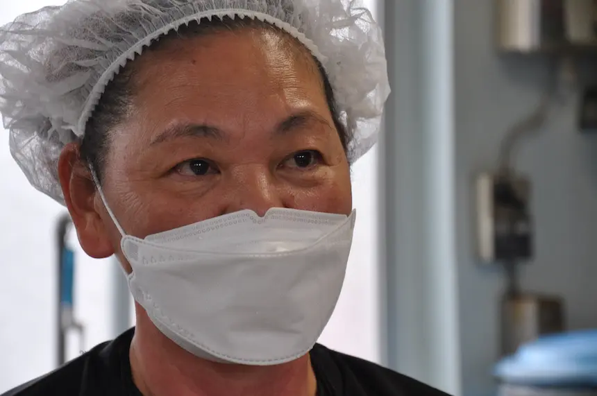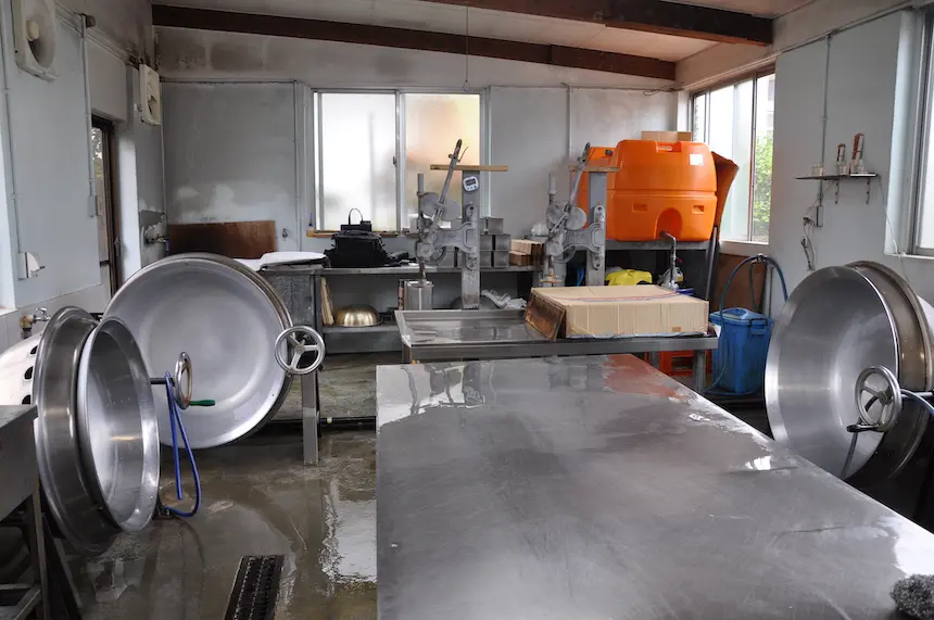 「工場には3つの地釜があるでしょ。みんなそれぞれを作るための地釜なの。一つは、島豆腐用。そして、ゆし豆腐用と、さらには、豆乳用。なぜって、それぞれ豆の濃さも、塩の濃度も違うから。一緒には作ることはできません」