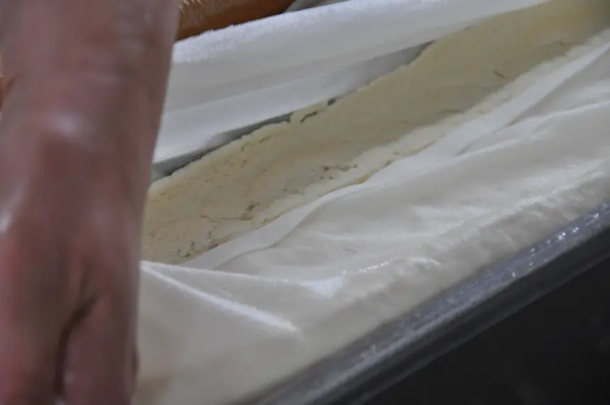 二つ目は、豆腐を成型する時、重しをして水を切りながら形を整えるのですが、重しに押されて飛びだした豆腐の端をきれいにするため、再度布で包みなおしてさらに重しを載せるという手間をかけていること。
