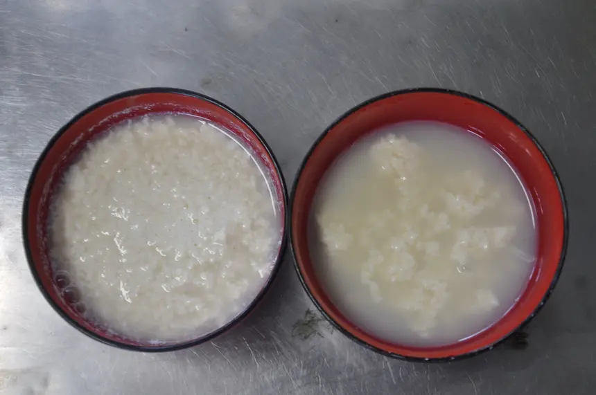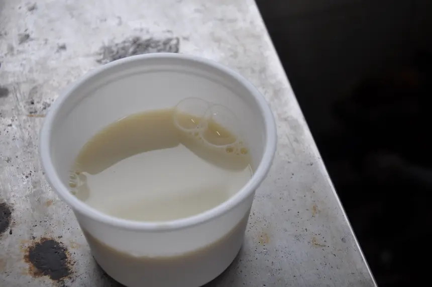 そして、3つ目。島豆腐を作るその成型前、豆乳が固まって汁に豆腐が浮かんでいる状態のものを一般的には「ゆし豆腐」といって、そのまま汁物としてよく食べます。これがまた二日酔いの翌朝にとってもいいのですが、玉栄では、ゆし豆腐はゆし豆腐を作るためだけに釜に火を入れ、決して島豆腐を作る時のついでにできるものではないというのです。