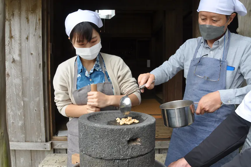 身支度を整え、簡単に今日の体験の概要の説明を受けたら、体験スタート!!糸満のNPO法人ハマスーキの事務局長、上原達彦さんのガイドで、まずは、庭に出て、一晩ふやかした大豆を昔ながらの石臼で挽きます。