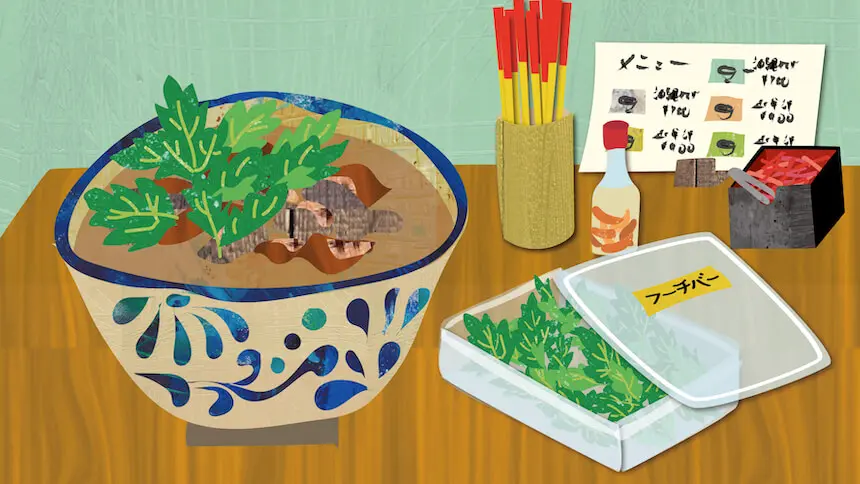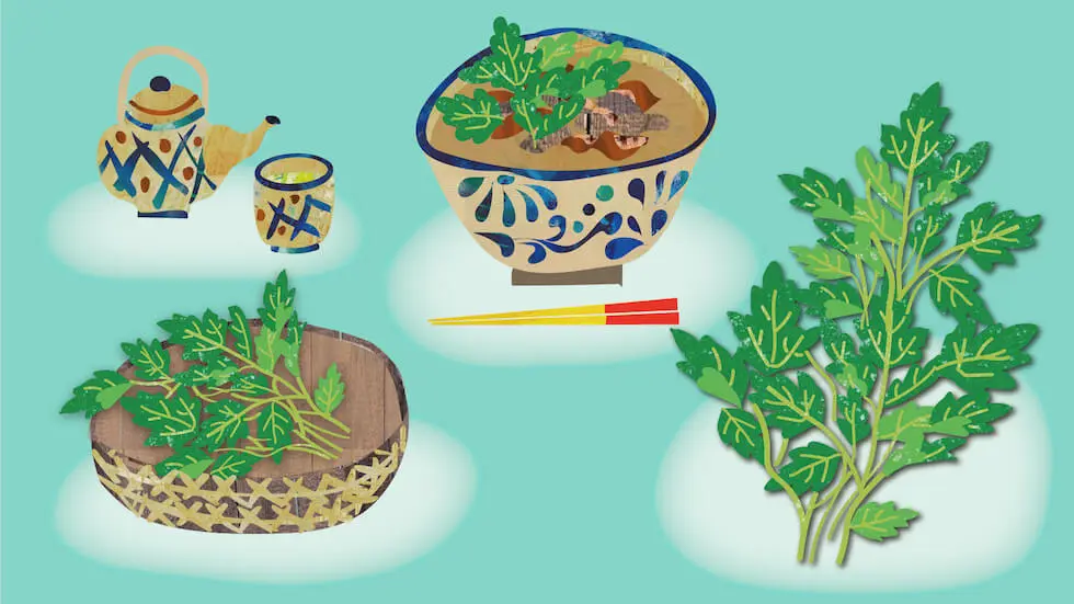 本土では、クッキーやお餅といったお菓子の食材として使われることが多いヨモギですが、沖縄では薬味として食卓や食堂でよく目にします。
