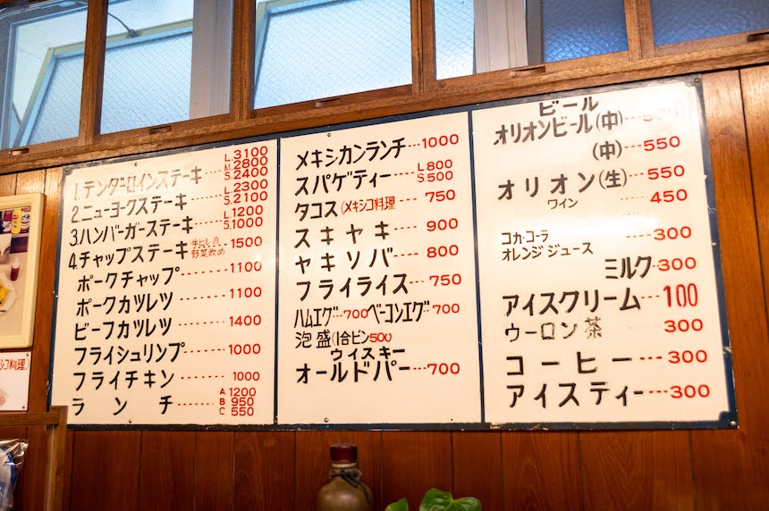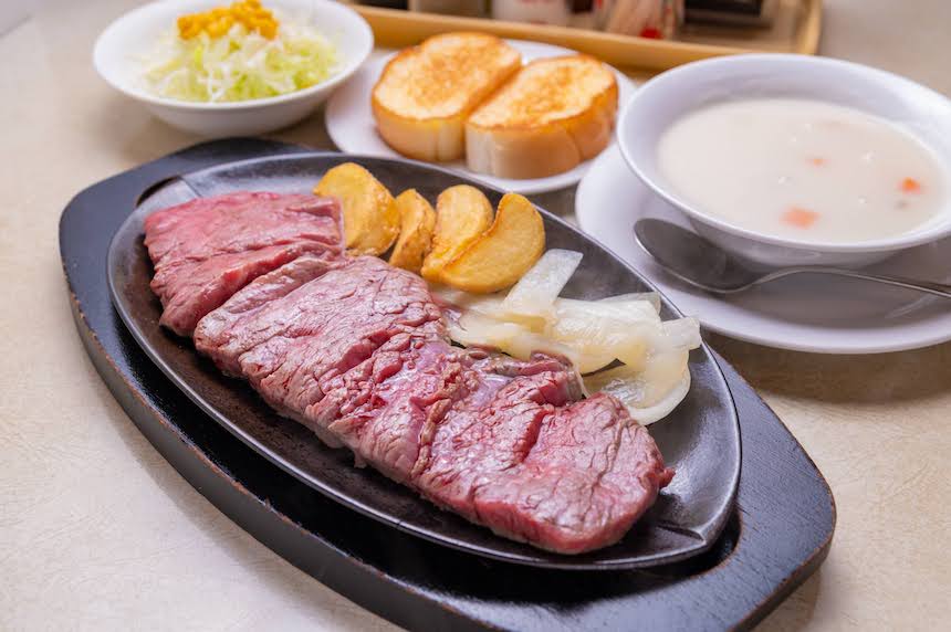 メニューも昔からほぼ変わっていませんが、やはり人気はステーキ。なかでも「ジョートーステーキ」と呼ばれるテンダーロインステーキは不動の一番人気を誇ります。一番良い肉という意味で、創業者が沖縄でよく使われる「ジョート(上等)」の名を付けたのだそうです。スッとナイフが入る肉質のステーキは、外はしっかり焼かれ中は柔らかく肉汁があふれ、噛むほどに旨みが広がって口の中が幸せいっぱいに。