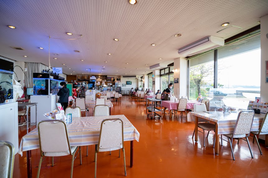 大きな窓から東シナ海が広がる最高のロケーション。広々とした店内は、外観のアメリカンな雰囲気とはまた違った、昭和レトロ感。