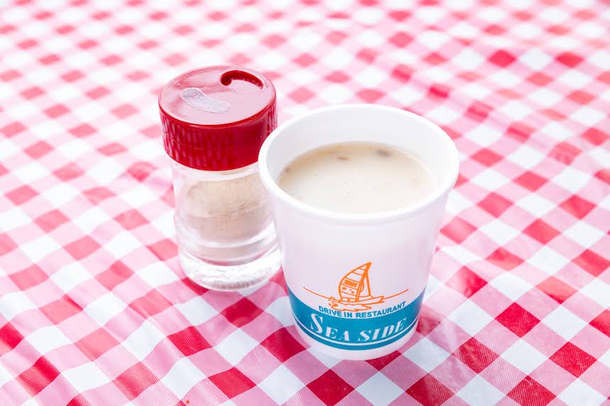店内でもテイクアウトでも絶大な人気を誇るのがスープ。細かく刻まれたハムやマッシュルームが入ったクリーミーなスープはクセになる味で、このスープだけを目的に来る人も少なくありません。コショウをかけて召し上がれ。