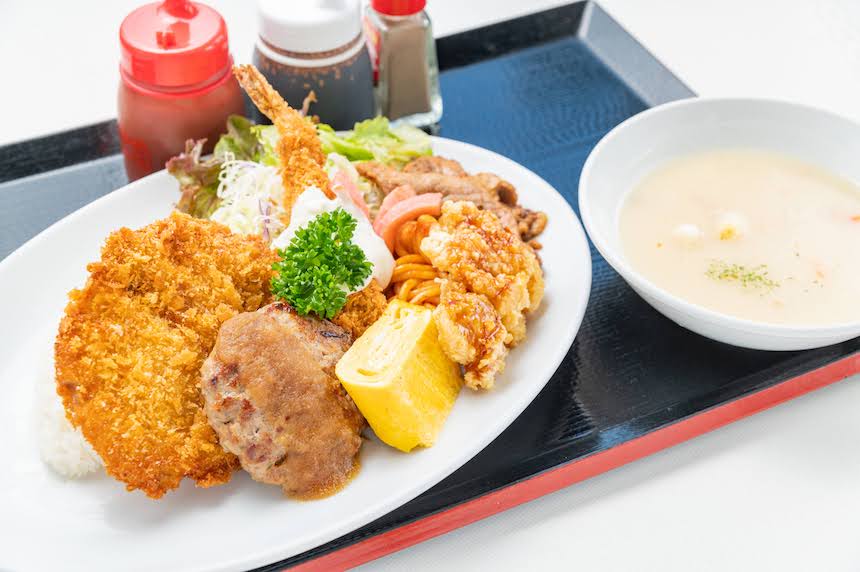 創業からずっと変わっていないメニューがA、B、Cの各ランチ。なかでも一番人気のAランチは、第一回コザAランチ選手権で優勝し、初代チャンピオンに輝いた一品。トンカツ、ハンバーグ、厚焼きタマゴ、チキンフライ、ウインナー、海老フライ、焼き肉にサラダ、スパゲッティ、ライスがワンプレートに乗った味もボリュームも文句なしのメニューです。